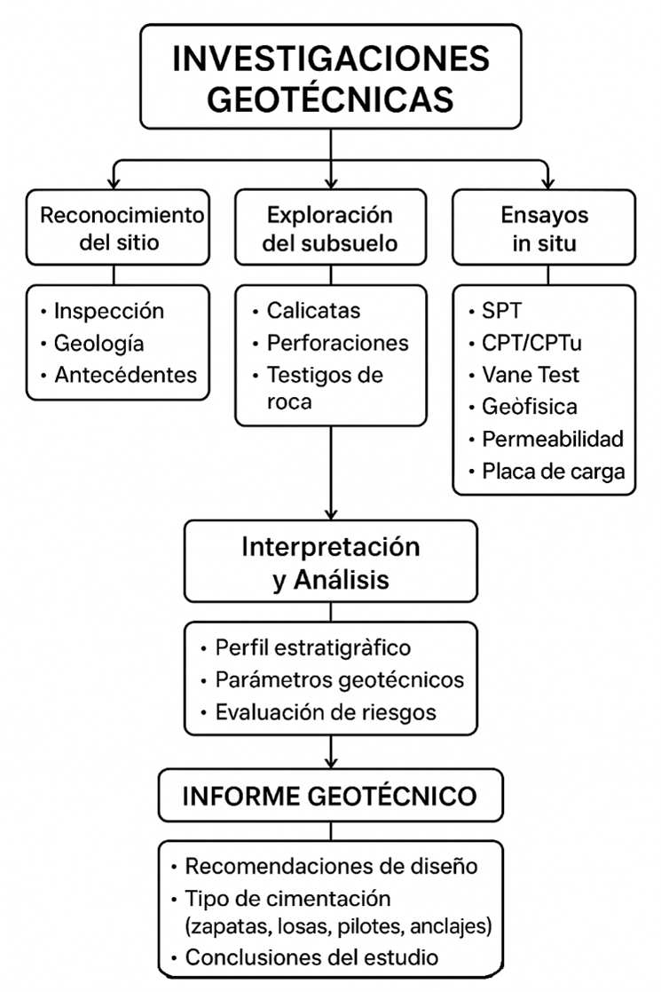 Las investigaciones geotécnicas son estudios realizados en el terreno para conocer las propiedades del suelo y la roca con el fin de diseñar cimentaciones y estructuras seguras y eficientes. Incluyen exploración del subsuelo, ensayos de campo y laboratorio, análisis e interpretación de datos.